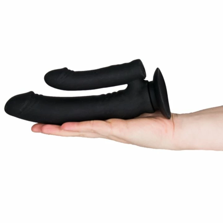 However you choose to play, press the button at the base of the smaller dildo and cycle through 10 toe-curling vibration modes. Meanwhile, the suction cup base lets you attach this silicone, double-penetration device to a smooth, flat surface for a hands-free romp.