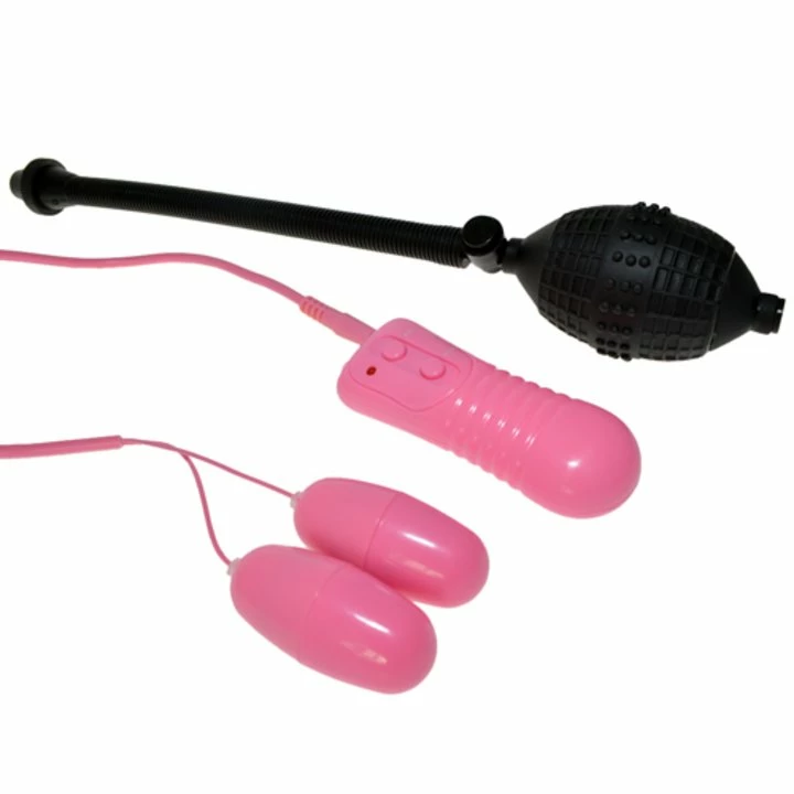 β’ Includes a suction pump and two powerful vibrating bullets for added sensations.